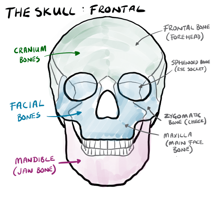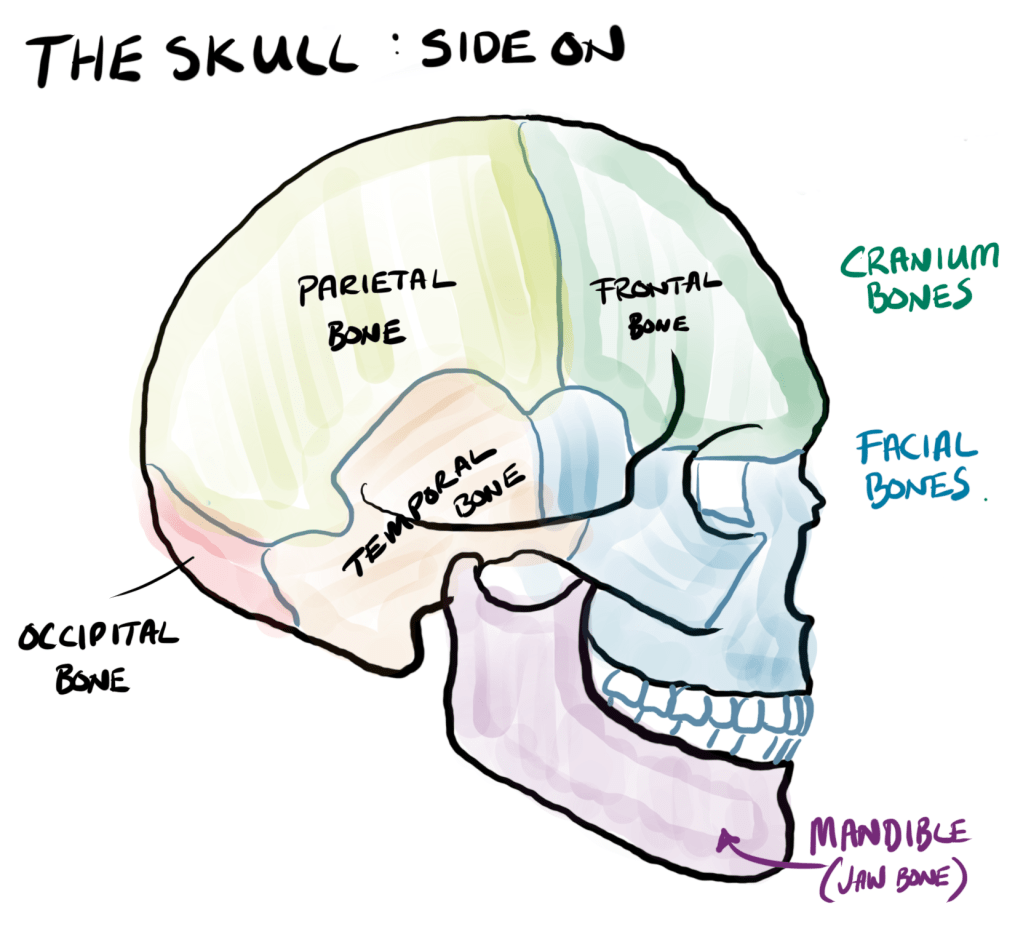Start nice and easy. The skull is the hard bone that covers the brain and made up of two bones: 1) mandible or jaw bone and 2) the cranium. So if you need to order a skull at any time make sure you get both bits. I’m going to be a bit cheeky (pun intended) by dividing the cranium into facial bones (those that make up the face and eye sockets) and cranium bones (the ones that cover the brain). Antamotically there is no difference but it will help when we talk about the brain parts later on.