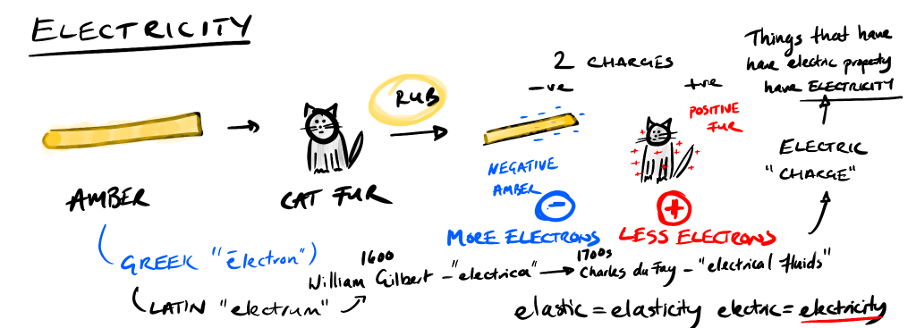 Those Greeks didn’t just their spend time thinking about the world they experimented in it. One of those experiments was with amber, fossilised tree sap, that when rubbed with animal fur (cat was preferred) would produce an effect which would deflect very light feathers when moved close it. We now know this as static electricity where there is an attraction or a repulsion depending on what charge is in excess or deficit.