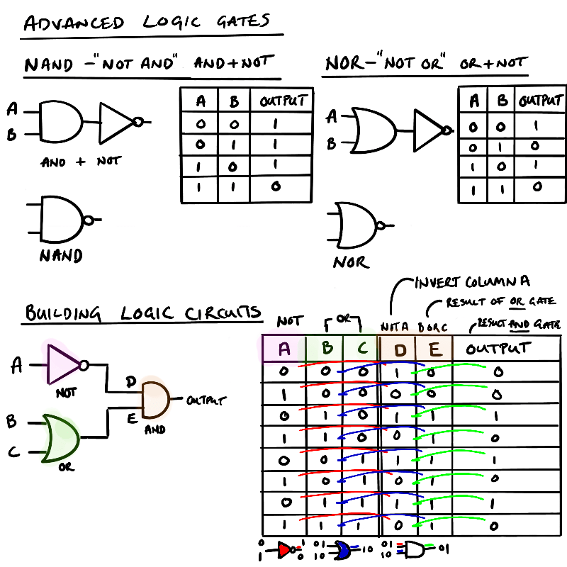 In electronics we use boolean logic and gates to build circuits. The AND, OR, and NOT gates are represented by symbols shown in the picture below and a Truth table that shows what the outputs would be based on the array of binary inputs.