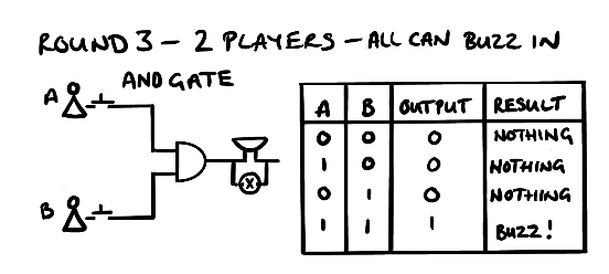 For the second round it gets a little more complicated as there are two buttons and a shared buzzer between two players so we need to add some logic to know the buzzer will go off if one of them presses their button.