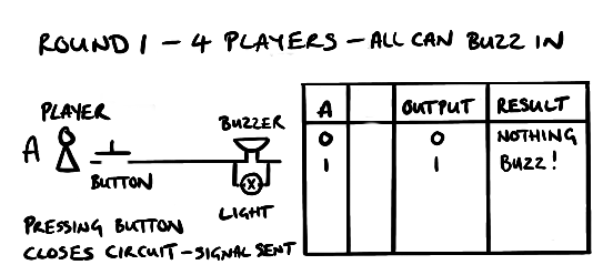 We can do this using an OR gate. As you can see from the truth table above picture above when either player presses their button the buzz will sound and the light will light up.