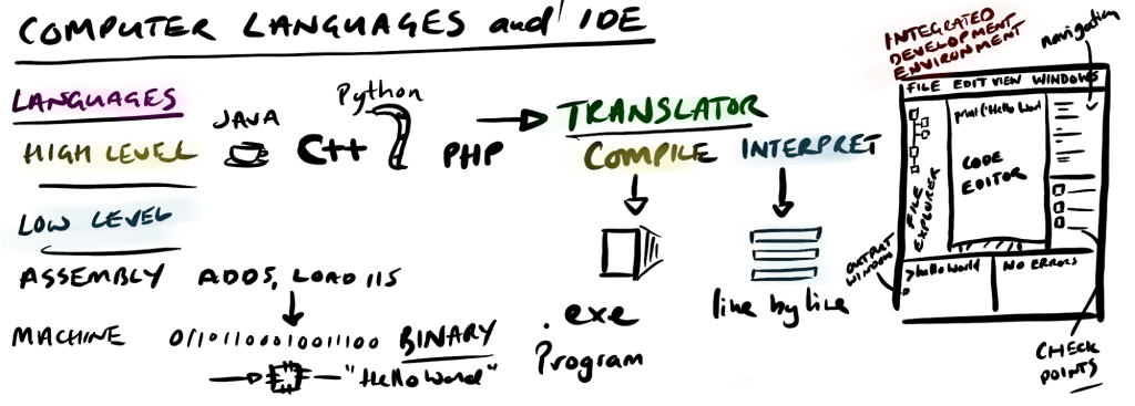 Both high-level and low-level languages have to converted to machine code for it to execute. At the heart of the computer there are switches, paths, and a store represented by binary code – zeros and ones or scratches or blanks on magnetised components. In order to get the languages to machine code they have to be translated into a machine readable format. It is possible to directly read binary and even write it but it’s tricky. Reading binary is more commonly found in reading network traffic which is sent in binary frames which make up packets – that’s another story. There are two ways of getting the programming language into a format that computers can read.