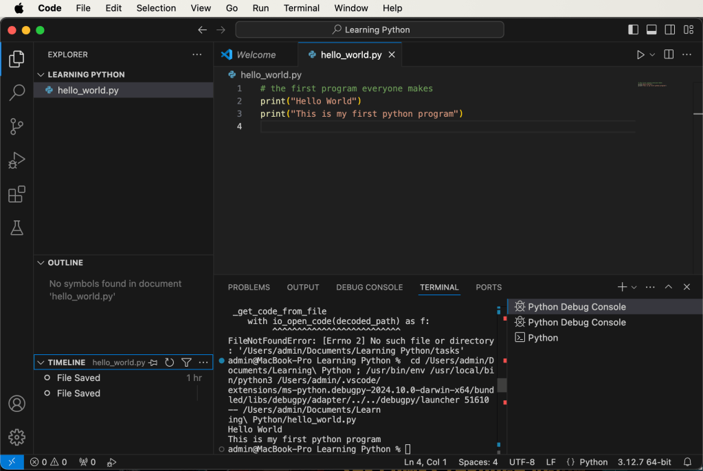 This is the main part of the IDE and the most helpful as it helps with the reading, writing and finding of the code you have on the screen. From the hello_world.py example above you can see that the writing is in different colours to show different types of code – green is a comment, functions are white (print) and strings are orange all on a calming black or dark background (staring at the same screen for long periods of time can be hard on the eyes).