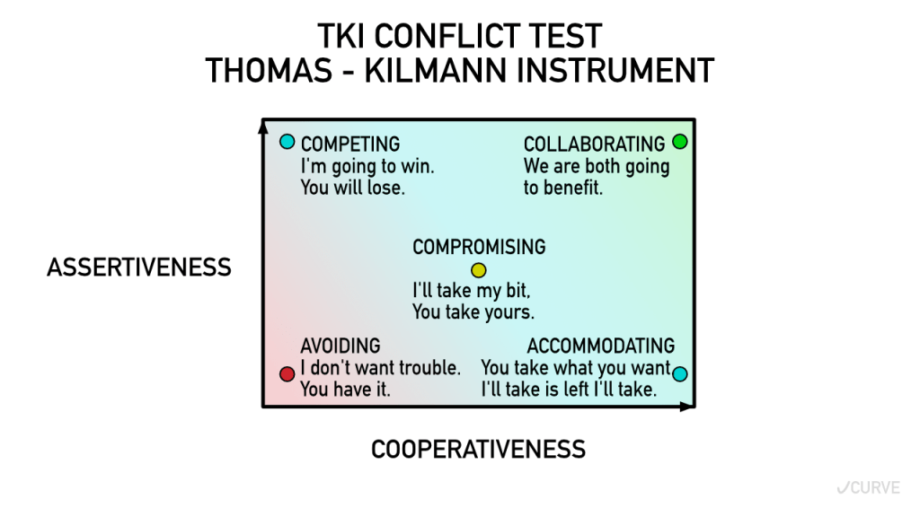 Thomas – Kilmann Instrument (TKI) is a way of judging how someone is dealing with conflict. It’s similar to the Blake and Moulton Management Grid setting up two contradictory dimensions.